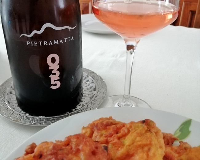 Durante un recente pranzo speciale, in abbinamento a un antipasto a base di fiori di zucca fritti in pastella con ripieno di olive, capperi e passata di pomodoro, ho l’occasione di assaggiare questo intrigante rosato fermo.