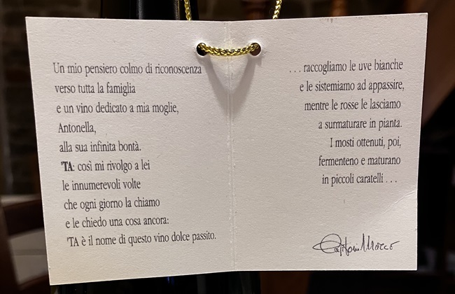 Al sorso, si offre teso e slanciato in virtù dell’ancora vivida freschezza, di una leggera tannicità e della ben presente sapidità che, nel loro insieme, ne sorreggono la ricchezza del corpo, la grande morbidezza e l’evidente – ma integrata – sensazione di calore; la spiccata dolcezza non ne appesantisce la beva che non diviene mai stucchevole. Il fin di bocca, molto lungo, ci abbandona lentamente lasciando la bocca pulita anche in virtù di una piacevole sensazione amaricante che ci conduce al sorso successivo.