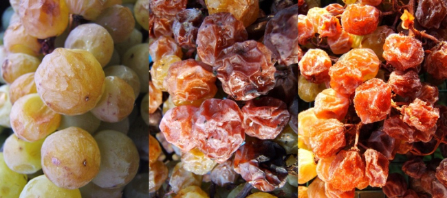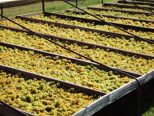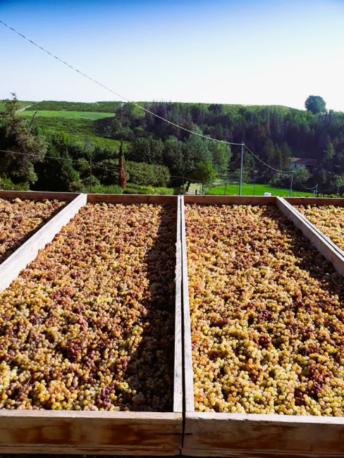 I grappoli migliori – più sani e spargoli – sono posti ad appassire all’aperto in singoli strati sulle stagere, delle caratteristiche stuoie con il fondo di rete o di doghe di legno; tali stagere saranno coperte durante la notte per evitare l’accumulo di umidità sui grappoli che potrebbe portare allo sviluppo di muffe. L’appassimento si protrae, generalmente, per circa 20-30 giorni e, in ogni caso, la pigiatura non avviene fino a quando le uve non hanno raggiunto almeno i 34 gradi babo; tali gradi esprimono i chilogrammi di zucchero presenti in un quintale di mosto.