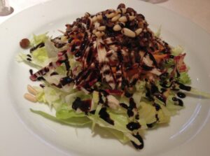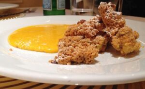 Oltre al già citato sorbir d’agnoli, la carta di Daniele Toaldo richiama la memoria della storia di questi luoghi con l’insalata dei Gonzaga, dove il dolce dell’aceto balsamico, dei pinoli e dell’uvetta si unisce all’acidulo della vinaigrette di verdure, dando vita a quella mescolanza agrodolce tipica della cucina delle grandi famiglie rinascimentali italiane.