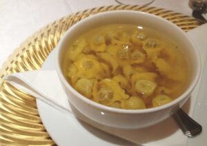 Il simpatico e musicale appellativo, che tradotto significa “bere nel vino”, designava una preparazione servita sempre in una scodella preriscaldata. Un mestolo di brodo, alcuni agnoli o cappelletti, ai quali veniva in seguito aggiunto a piacere vino rosso di corpo, oppure frizzante, come ad esempio il Lambrusco. Si riteneva, peraltro, che questo piatto dovesse essere consumato in piedi e davanti al camino acceso, dandosi vicendevolmente le spalle, poiché si riteneva poco piacevole il colore del brodo mescolato al vino.
