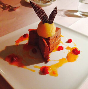 Un percorso gastronomico tanto ricco, per finezza delle preparazioni e qualità delle materie prime, non può che concludersi lasciando in bocca un dolce sapore. È quello dei dessert, tra cui abbiamo provato la deliziosa Terrina al fondente nero con daquoise alle mandorle e sorbetto al frutto della passione e i perfetti gelati – ai gusti di vaniglia, pistacchio e caffè – che rinfrescano e chiudono con sobria raffinatezza un pasto che permette di apprezzare appieno le peculiarità e i profili più importanti della cucina valdostana, in una delle sue migliori espressioni.