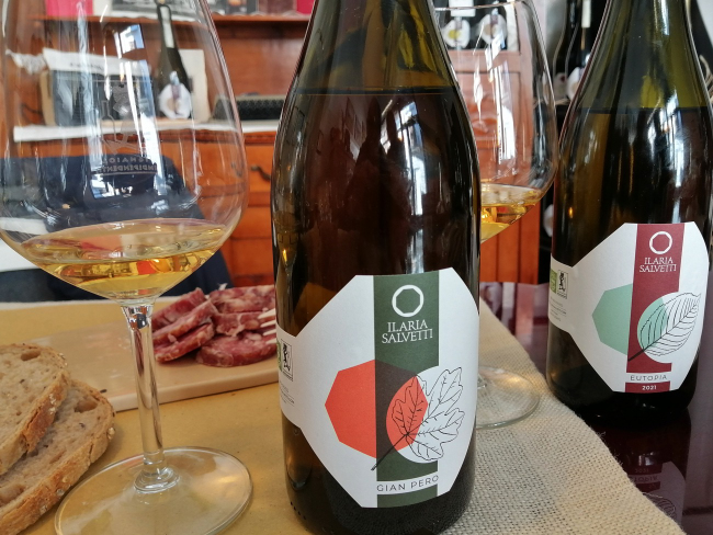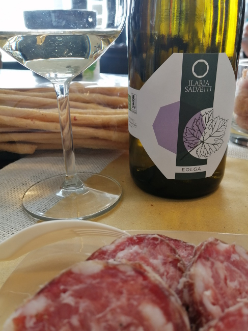 La terza proposta è un vino bianco fuori dal disciplinare, per cui senza alcuna denominazione (in realtà non è indicata in etichetta neppure l’annata, ma Salvetti mi rivela l’anno di produzione); si tratta di una sorta di macerato, in quanto i grappoli, dopo diraspatura e pressatura soffice, rimangono a contatto con il mosto per 24 ore, sempre in presenza di lieviti autoctoni. In effetti, nel bicchiere il colore è un ambrato chiaro luminoso; i profumi richiamano subito aromi di fiori di agrumi, mela ed erbe di campo, come l’elicriso. In bocca, è rotondo, avvolgente, con un ottimo equilibrio acido e un finale mieloso e finemente amaricante.