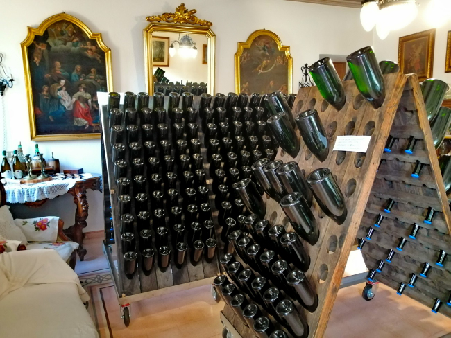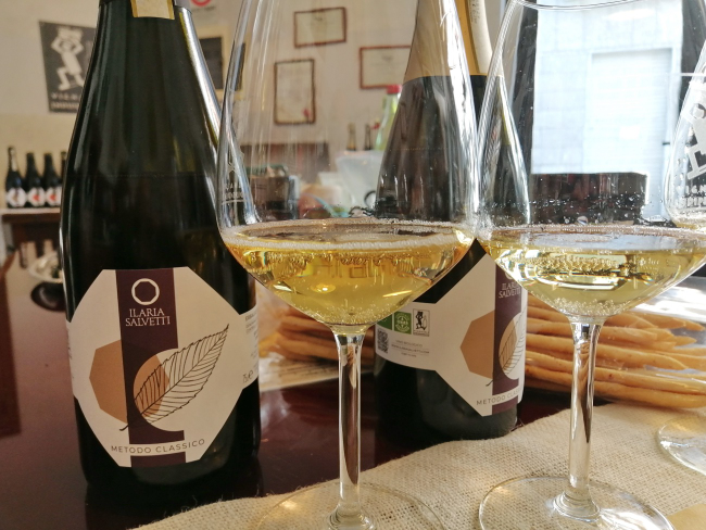 A proposito della cantina di Ilaria Salvetti, la Guida 2024 Slow Wine scrive: “… è altrettanto piccola, tanto da far quasi venire in mente una realtà garagista.” In effetti, un altro aspetto curioso e sorprendente da sottolineare è la sede delle pupitre con le bottiglie in punta durante la maturation sur lies: in pratica il salotto della casa di famiglia, perfettamente arredato con tanto di splendidi affreschi e quadri alle pareti, un divano, una poltrona, alcuni mobili, come una cassettiera d’antiquariato e tavoli in legno con una collezione di cavatappi e altri oggetti della tradizione. Sicuramente una “location” particolare e originale per le bottiglie del loro metodo classico.