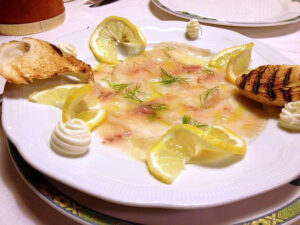 Tra gli antipasti, spiccano un memorabile carpaccio di trota affumicata in casa, la carpionata di fiume, ma anche il “salame” di pesce di fiume, un rotolo di pesce bianco, tagliato a fette e guarnito con julienne di peperoni rossi e gialli. Sempre sul fiume, troviamo alcuni interessanti primi piatti, come i tortelli di luccio perca agli asparagi e la zuppa di pesce di acqua dolce; tra le pietanze, si “pesca” bene con la tinca al cartoccio, ma anche con l’anguilla, che si può ordinare dorata, alla griglia, oppure in umido.