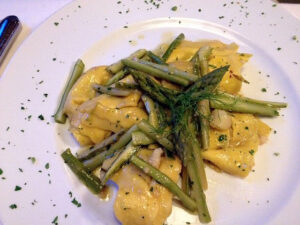 Dal petto d’oca affumicato e stagionato degli antipasti, si passa ai ravioli d’anatra con sugo di brasato, alle mezzelune di ricotta di capra e ortiche e, tra i secondi, la frittata di cipolle (di Castelnuovo Scrivia), lo stracotto di puledro, l’anatra con le fave e il carpaccio di magatello con il sedano di Alluvioni Cambiò.
