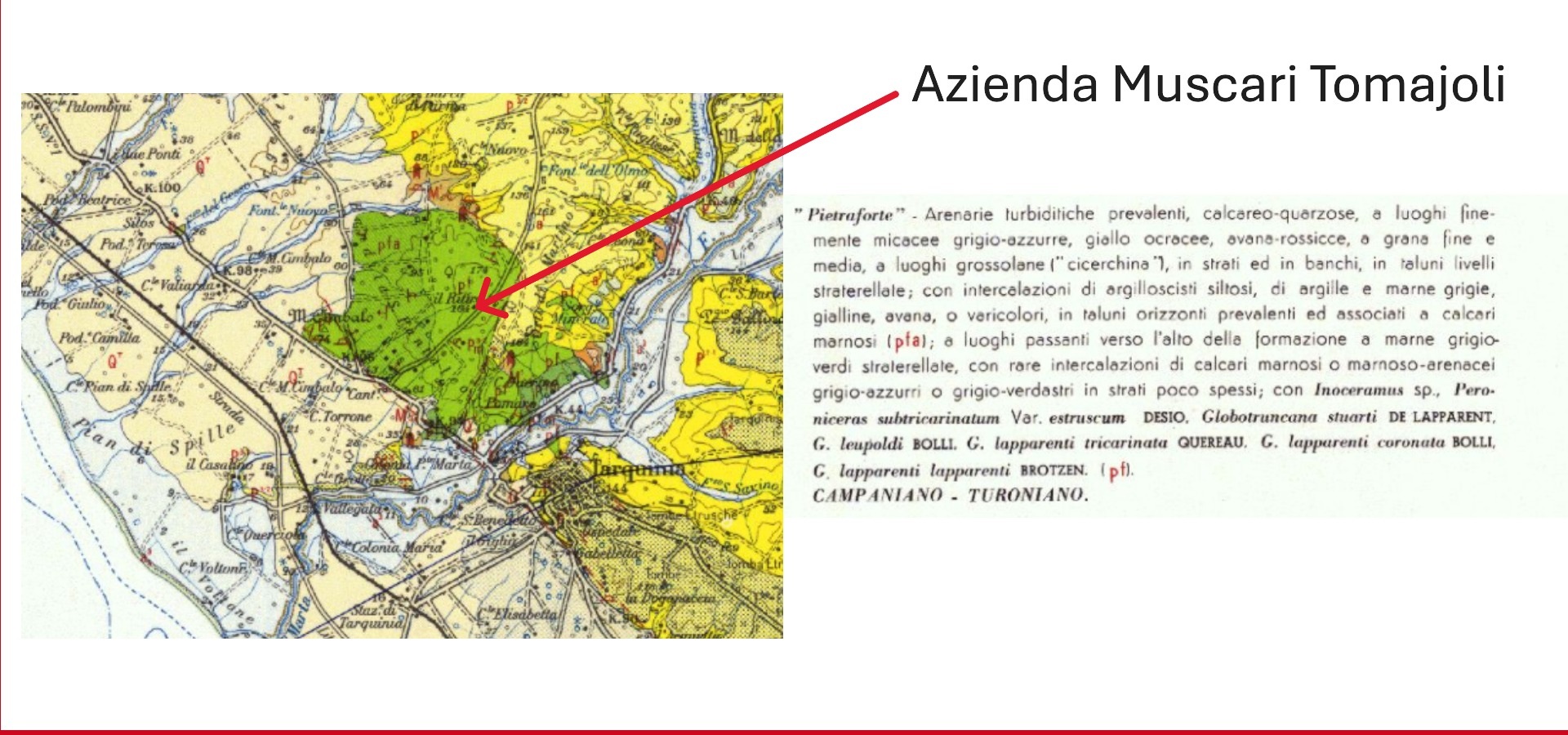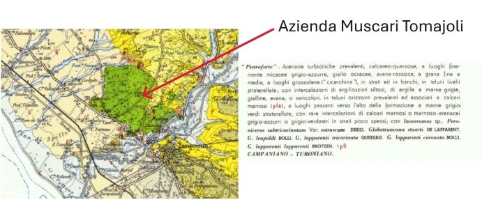 Nella tenuta Muscari Tomajoli, il sottosuolo è dominato dalla pietra forte, un’arenaria a grana fine con cemento carbonatico del Cretacico Superiore assai ricca di macro e microfossili. Si tratta di una pietra molto usata in costruzione per la sua resistenza; è stata utilizzata, ad esempio, per alcuni palazzi storici di Firenze quali Palazzo Vecchio, Palazzo Medici, Palazzo Pitti e Palazzo Strozzi. Questa roccia, ricca di minerali, definisce la matrice argilloso-calcarea del terreno, conferendo ai vini una spiccata sapidità e una notevole struttura. La capacità di ritenzione idrica di questi suoli, unita alla loro permeabilità, costringe le radici a scendere in profondità, favorendo un ottimale equilibrio vegeto-produttivo.